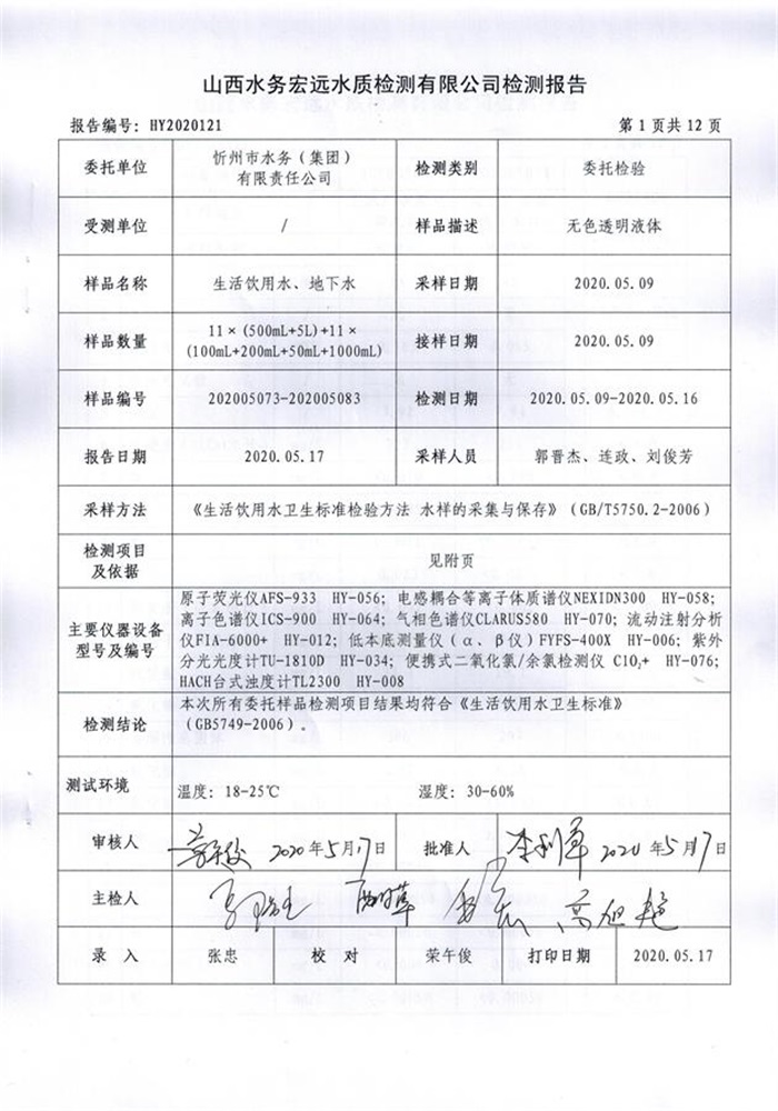 忻州城區(qū)公共供水水源水、出廠水、管網(wǎng)水、管網(wǎng)末梢水2020年5月份水質(zhì)信息公示