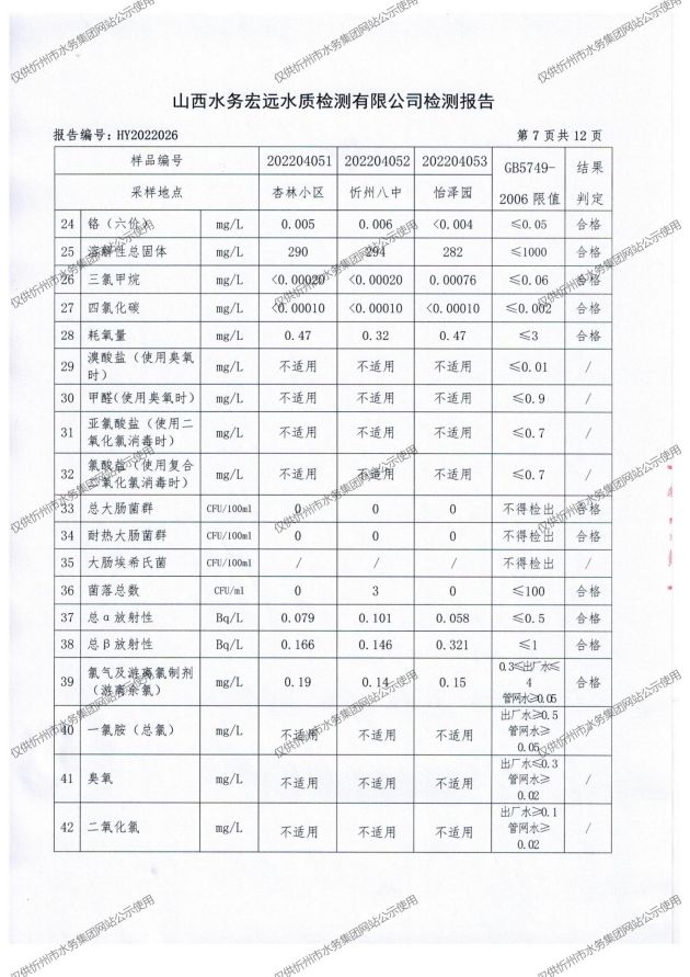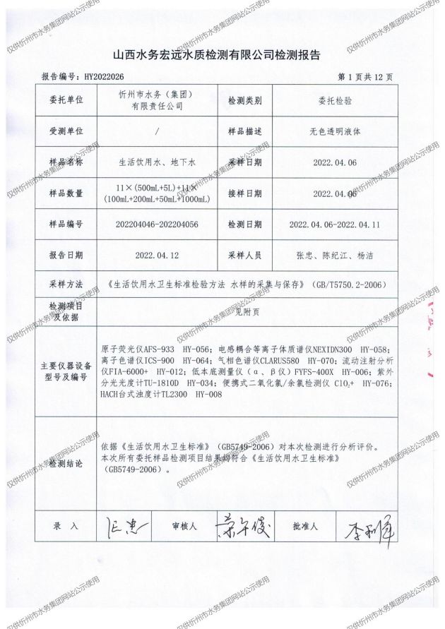 忻州城區(qū)公共供水水源水、出廠水、管網(wǎng)水、管網(wǎng)末梢水2022年4月份水質(zhì)信息公示