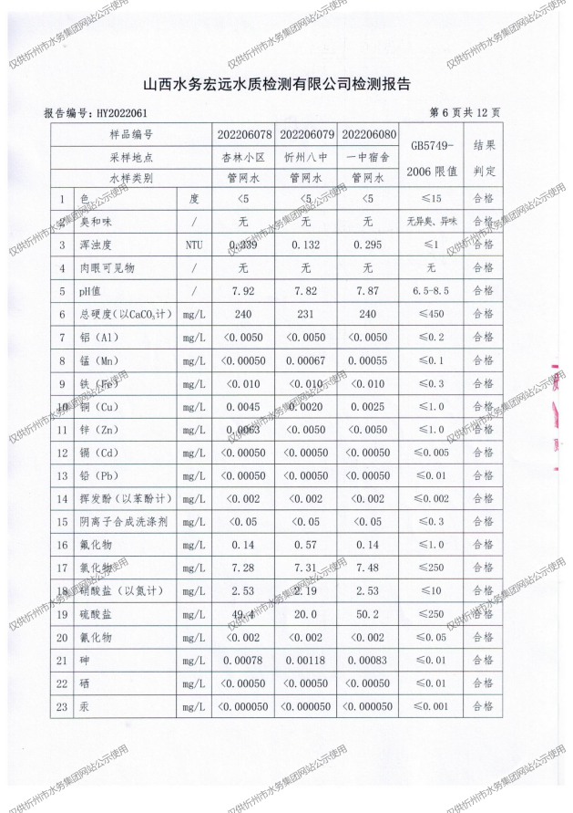 忻州城區(qū)公共供水水源水、出廠(chǎng)水、管網(wǎng)水、管網(wǎng)末梢水2022年6月份水質(zhì)信息公示